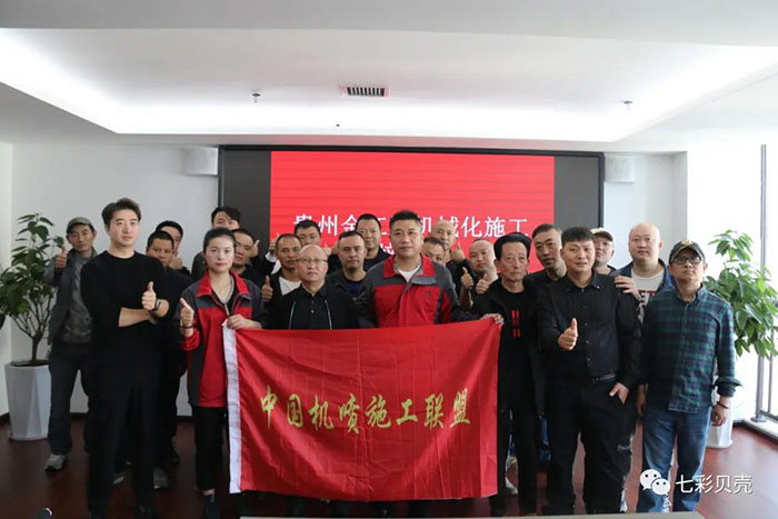 (授牌合影) 結束語 唯有把品質和服務放在首位,才能獲得廣大消費者的青睞。自創立以來,七彩貝殼堅守質量和服務生命線,對產品和服務精益求精,匠心雕琢,致力于為消費者打造最優質的產品、提供最專業的服務。“兩工三合”機械化施工培訓是中國機噴施工聯盟和七彩貝殼集團在推行機械化施工道路上的一個重要舉措,也是推動機噴施工轉型升級的關鍵。